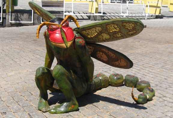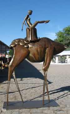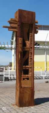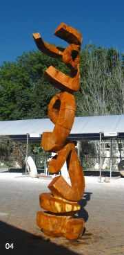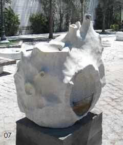 最先完成作品的是匈牙利作者“Attila",他把一块石头以几何构成的方式雕刻镂空,留下自然石材的边缘,形成人文与自然的强烈对比;应该说比较富有西方现代主义风格。Lluis来自西班牙北部的加泰窿尼亚,小伙子很年轻,但已经有了很多创作营的经验,并且他的作品思路非常飘逸,充分展现了西班牙人融合于血液中的艺术情趣;另外,他还有乐于助人的性格,在休息时他帮我卸掉了二块石料,因此,他是我最喜欢的朋友之一。Hermann是位中年的奥地利雕塑家,娴熟的木雕技巧以及厚重的作品构思体现出与他本人性格相似的铿锵力度。秘鲁的朋友Pablo,就在我身边,热心地教我西班牙语,可惜他的英语和我的西班牙语一样可怜,但这些天的朝夕相处已经消磨了我们之间的距离,而雕塑家之间也不一定需要语言作为唯一沟通的桥梁。他的作品简直与霍去病墓的石刻有异曲同工之妙,从其作品中你看不到当代雕塑的机巧构思,但你能感受到的是浑厚的力量。是他从古代玛雅文化中所汲取的能量精华。丹麦艺术家Allan的长相酷似北欧海盗,加上一身行头都不用化妆就可上戏。他的作品主材是木头,另外利用皮革、布料、铁钉、麻绳等混合材料为辅料,为观众呈现出一个魔幻色彩浓重的怪物形象,这充满想象力的角色把人们引入了童话的世界。Fernando是个来自阿根廷西部省份Mendosa的作者,由于语言问题无法与他沟通,他所完成的是唯一一个全金属锻造作品,变形的长腿牛背上的长腿女郎向观众翘起双腿,足够浪荡。Mykhailo Levchenco 是位来自基辅的乌克兰年轻作者,属于学院科班出身,有出色的写实功底,也许因为如此,我们有更多的交流话题,他的作品是金属和木材的组合抽象形体,作品影像鲜明,可以看到有空间构成方面的考虑。Baku是侨居布市的日本人,一看工作状态就知道是老江湖,像很多日本雕塑家一样,手段熟练,稳扎稳打,工艺精湛,在六天时间内完成作品,厉害啊!体会其作品含义,炸弹+象脚,无外乎人类文明与自然界之博弈。其他三位阿根廷作者是Laura、Emiliano,Maria,都是石刻作者,其作品倒也别有情趣,不一一介绍了。