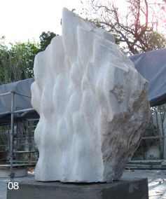 安顿下来后组委会的工作人员直接带着我到达了工作现场,会见了组织者和部分国际国内的艺术家,大家在当天已经开始工作了。当看到他们为我准备的石材的时候,有点傻眼了,合同中描述的是将给我提供120cm×60cm×40cm的材料,而眼前的是一块尺寸超过计划颇多的天然石头,原有的计划必须完全放弃,重新根据现场材料构思新的方案。组织者应我的要求提供给我180mm的角磨机、大个的锤子和开荒的凿子。说实在的,我并不是很明确自己的作品在八天后会是什么样子,不过没有什么选择,走一步看一步先干起来再说;对于这个挑战,既然老天让我来到这个遥远的地方,我相信他也会让我顺利完成既定的目标。