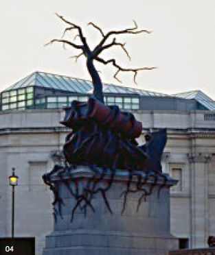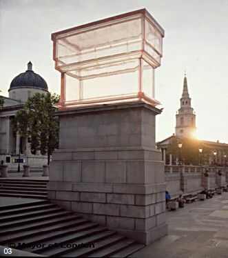 我以伦敦特拉法加广场的第四根柱基为例。即使不能说是最有名的景点,特拉法加广场至少被很多人看作是伦敦的焦点之一。除了它作为主要的旅游地之外,特拉法加广场几十年来一直是国家庆典以及政治和社会集会场所。在市长的新提议下,广场近来更加亲近游人,更具欧洲广场的布局特色。