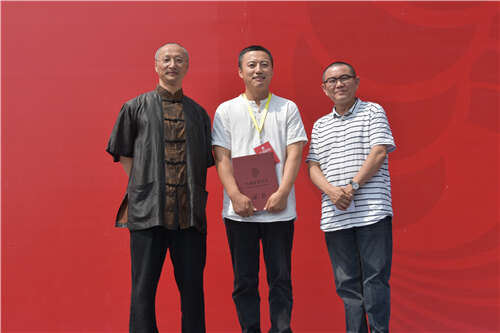 为金奖获得者颁奖(左起曾成钢、冯崇利、傅中望) 海宁大展历时三年多的认真筹划与反复论证,以“潮起东方”为主题,采用公开征集和特别邀请相结合的方式,共展出雕塑作品37件。参展雕塑内容丰富、主题明确、材质多样、制作精良,全部由国内外参展雕塑家针对海宁地域特色新近创作并在中国雕塑学会艺术部门监制下完成,这些雕塑将在海宁盐官度假区潮起东方雕塑公园永久陈列,成为钱塘江畔又一极负盛名的观潮景观标志,并为国内外游客带来一场丰富的视觉盛宴。