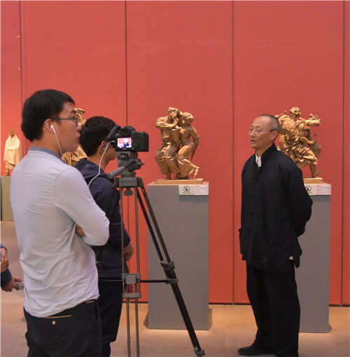 曾成钢先生接受媒体采访 开幕式由山东省文化厅副厅长张桂林主持。冯远、杨枫、曾成钢分别代表中国文联、山东文联、中国雕塑学会致辞;山东美术馆馆长柳延春,中国雕塑学会副会长、湖北美术馆馆长傅中望分别上台宣读获奖名单。山东省人民政府副省长季缃绮宣布展览开幕。